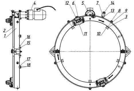 1. Рама разъемная 2. Планшайба разъемная 3. Прижим 4. Привод 5. Вал-шестерня 6. Суппорт отрезной 7. Механизм замыкателя автоподачи 8. Шпилька 9. Гайка 10. Накладка 11. Резец 12. Звездочка 13. Стойка 14. Кнопка 15. Винт 16. Проушина 17. Петля откидная 18. Винт